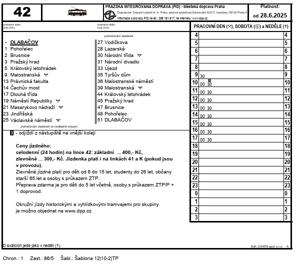 Milovníci historie, romantických projížděk a jedinečných pohledů na pražské památky mohou slavit. Oblíbená turistická tramvajová linka 42 bude během letních měsíců jezdit častěji. V reakci na rostoucí zájem turistů i místních zkracuje od 28. června do 31. srpna 2025 svůj interval ze 40 na 30 minut. Cestující se tak mohou těšit na plynulejší a pohodlnější objevování krás hlavního města z oken historických vozů.