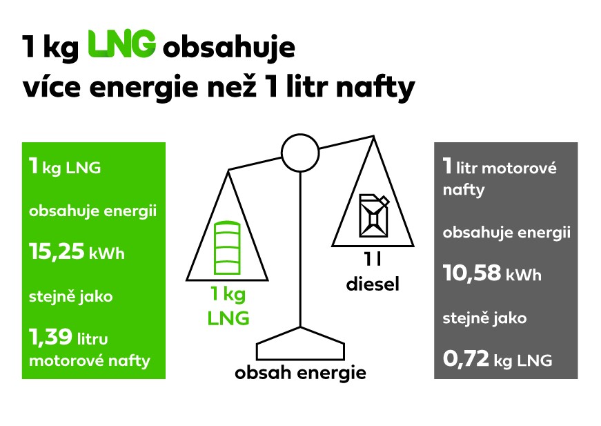LNG (zkapalněný zemní plyn) je alternativní palivo, které je aktuálně k dispozici, a dokáže ve srovnání s tradiční naftou snižovat emise CO₂. LNG motor vypouští oproti naftovému motoru o 70 % méně oxidů dusíku. Navíc se při spalování zkapalněného plynu neuvolňují pevné částice, čímž se významně zlepšuje kvalita ovzduší v nejbližším okolí. Motor poháněný LNG je ve srovnání s dieselem tišší.