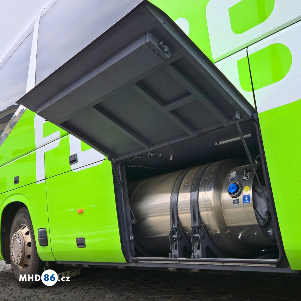 Autobusy budou plněny pohonem LNG v Praze a v Glivicích. Právě nádrž na zkapalněný zemní plyn znamenala i změnu ve vnitřním uspořádání autobusu. Na prezentaci nového autobusu ukázal Jan Konopásek nádrž na LNG, která se nachází na levém boku autobusu, kde u dieselových vozů bývá prostor pro zavazadla. Také toaleta pro cestující je přemístěna do zadní části autobusu. Většina prostoru pro zavazadla se nově nachází na pravém boku autobusu, což umožní bezpečnější nakládku a vykládku.