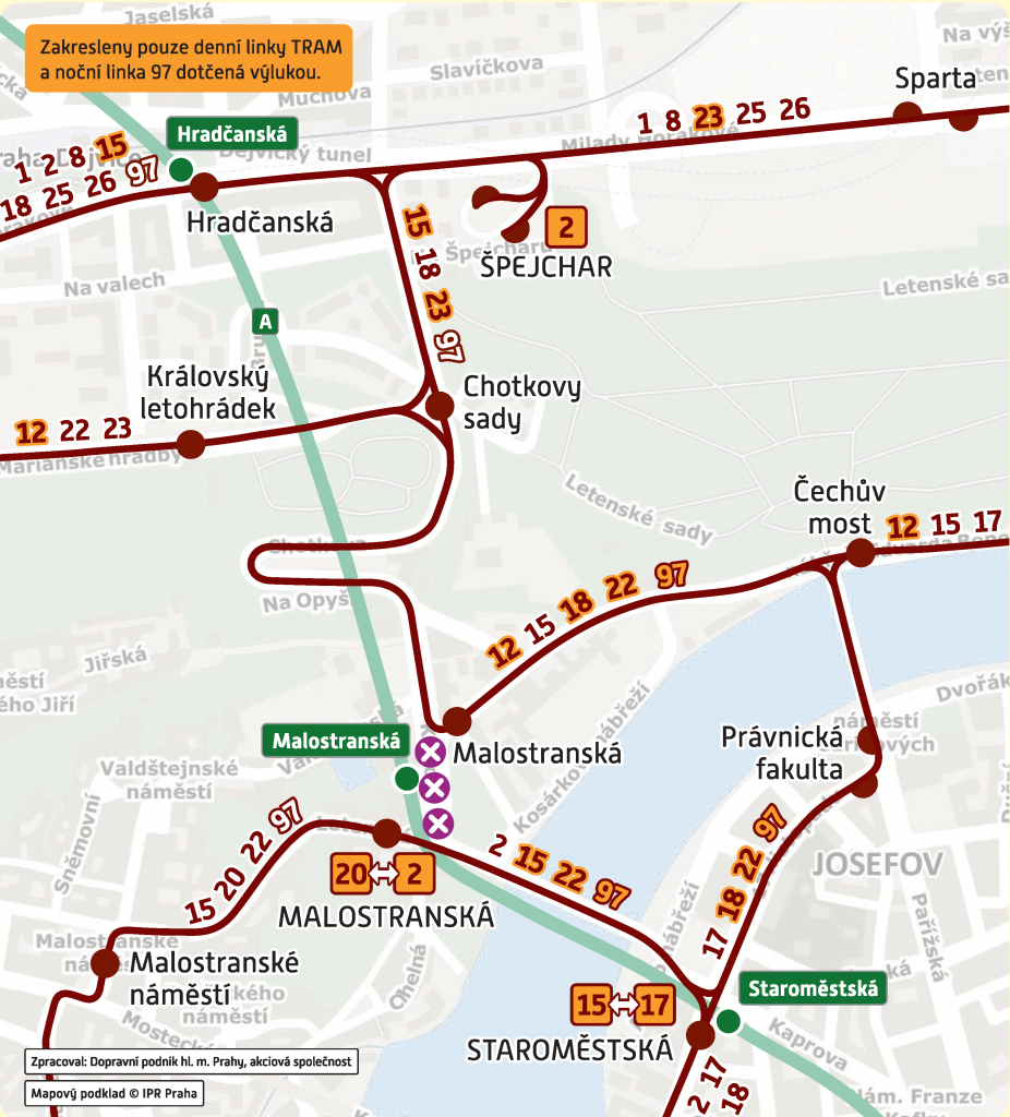 Z důvodu opravy tratě bude od soboty 31. května od cca 0:00 do pátku 13. června 2025 do cca 24:00 obousměrně přerušen provoz tramvají v části ulice Klárov v úseku u zastávek Malostranská.