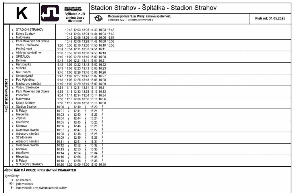 Linka K byla v loňském roce zahájena v polookružní trase Stadion Strahov – Vozovna Střešovice – Vítězné náměstí – U Matěje – Na Pískách – Macharovo náměstí – Vozovna Střešovice – Stadion Strahov. Dopravní podnik na linku nasazuje historické vozy Karosa, Irisbus a Škoda RTO.