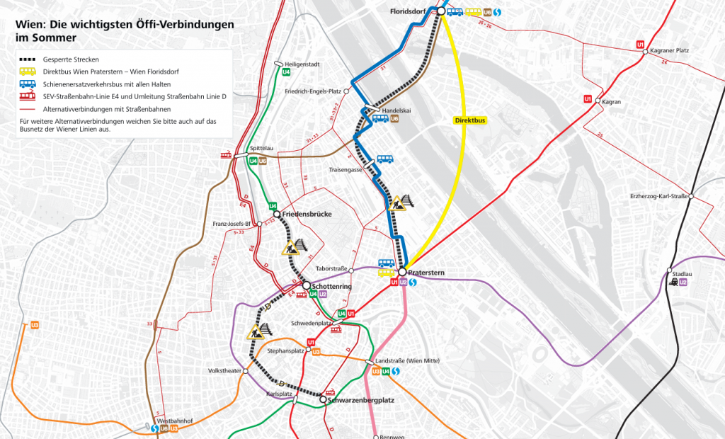 Wiener Linien se v létě zaměřují především na modernizaci linky metra U4. V úseku Schottenring – Friedensbrücke probíhá obnova více než 120 let staré tunelové infrastruktury. Od 28. června do 1. září 2025 bude linka U4 rozdělena a bude jezdit v úsecích Heiligenstadt – Friedensbrücke a Hütteldorf – Schottenring. Jako náhradní spojení poslouží tramvajová linka E4, která pojede z Nußdorfu až na Schottenring. Tramvajová linka D bude navíc odkloněna a pojede také z Nußdorfu na Schottenring, odkud bude pokračovat přes Schwedenplatz a Schwarzenbergplatz po své obvyklé trase až na Absberggasse.