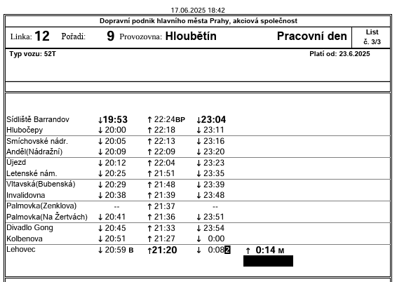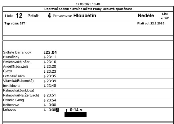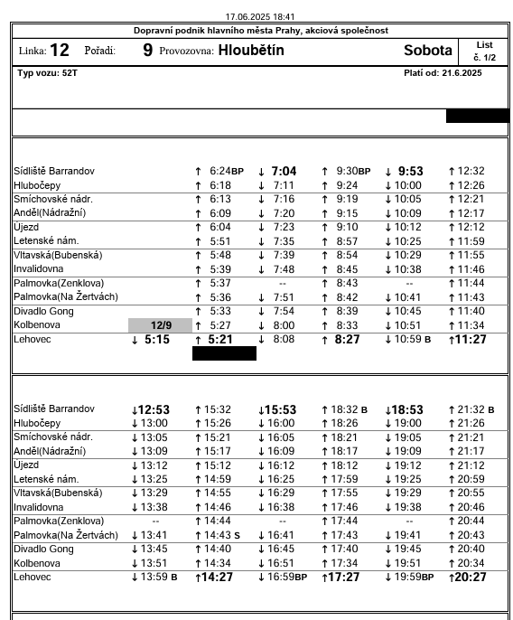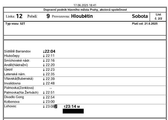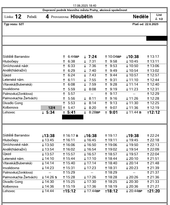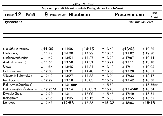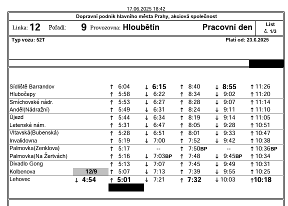 Dopravní podnik hl. m. Prahy zveřejnil jízdní řády nové tramvaje Škoda 52T. Nasazována bude na linku 12, v trase Lehovec – Sídliště Barrandov. Tramvaj s evidenčním číslem 9503 musí nyní najezdit 20 000 kilometrů s cestujícími v rámci testovacího provozu. Následující jízdní řády platí pro období 21. až 27. června 2025. Nasazení vozu Škoda 52T není garantováno.
