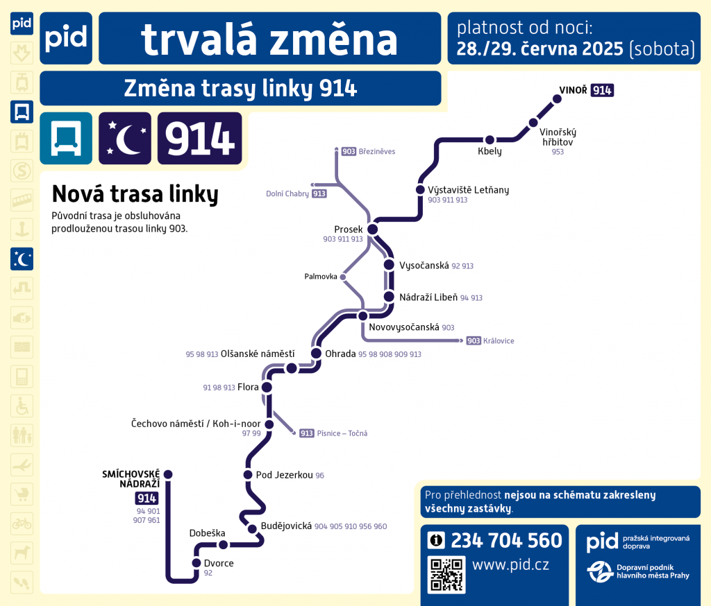914 Linka je v původní trase Březiněves – Ďáblice – Třebenická zrušena a nahrazena nově trasovanou linkou 903. Číslo 914 je použito pro novou linku v trase Smíchovské nádraží – Dvorce – Zemanka – Ryšánka – Poliklinika Budějovická – Budějovická – Michelská – Bohemians – Bělocerkevská – Flora – Rokycanova – Ohrada – Nádraží Libeň – Vysočanská – Prosek – Rychnovská – Toužimská – Kbely – Vinořský hřbitov – Vinoř (noční provoz celotýdenně v intervalu 60 minut).