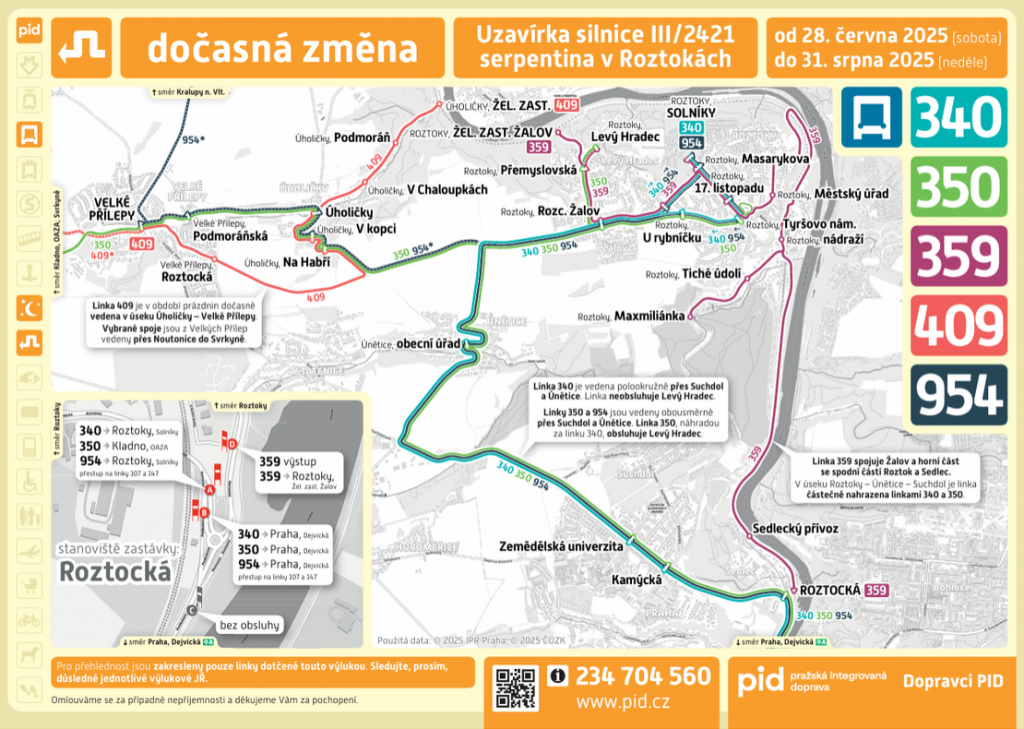 Od soboty 28. června do neděle 31. srpna 2025 dojde k významným změnám v autobusové dopravě v oblasti Roztok, Sedlece, Suchdola, Únětic a okolí. Důvodem jsou pokračující stavební práce v Roztokách. Změny se dotknou linek 340, 350, 359 a 409. Cestující by se měli seznámit s novými trasami, zřízenými, zrušenými a přemístěnými zastávkami, aby se vyhnuli komplikacím.