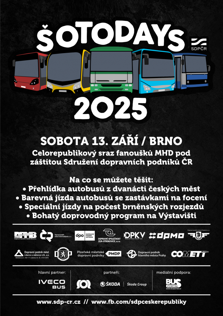 V sobotu 13. září 2025 se Brno znovu promění v hlavní město všech milovníků městské dopravy. Po úspěchu nultého ročníku v roce 2023 se vrací akce ŠOTODAYS – celorepublikový sraz šotoušů, nadšenců, řidičů, dopravních fajnšmekrů i široké veřejnosti. Letos bude program ještě bohatší, jízdy ještě zajímavější a přehlídka vozů ještě rozmanitější.