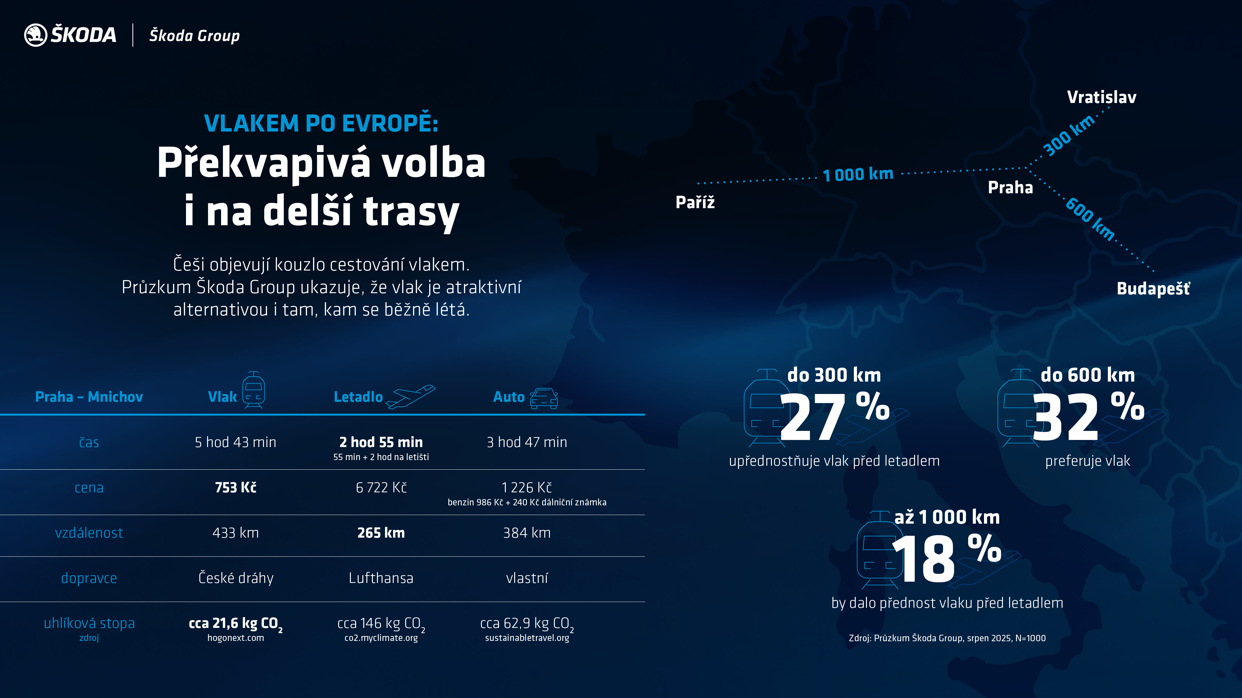 – O letních prázdninách velká část Čechů cestovala po Evropě. Nedávný průzkum Škoda Group odhalil zajímavé trendy ve výběru dopravních prostředků. Jakkoliv osobní auta hrají prim, ukazuje se, že vlak je nezanedbatelnou alternativou k letadlu i na středně dlouhých evropských trasách.