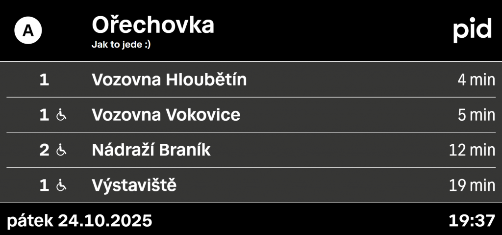 Organizátor Pražské integrované dopravy ROPID přichází s novou funkcí, která potěší nejen fanoušky veřejné dopravy, ale může být užitečná i pro provozovatele různých podniků. Na svém webu nyní umožňuje komukoli bezplatně si vygenerovat vlastní odjezdovou tabuli, která designem i daty odpovídá té, kterou cestující znají z moderních zastávkových panelů.