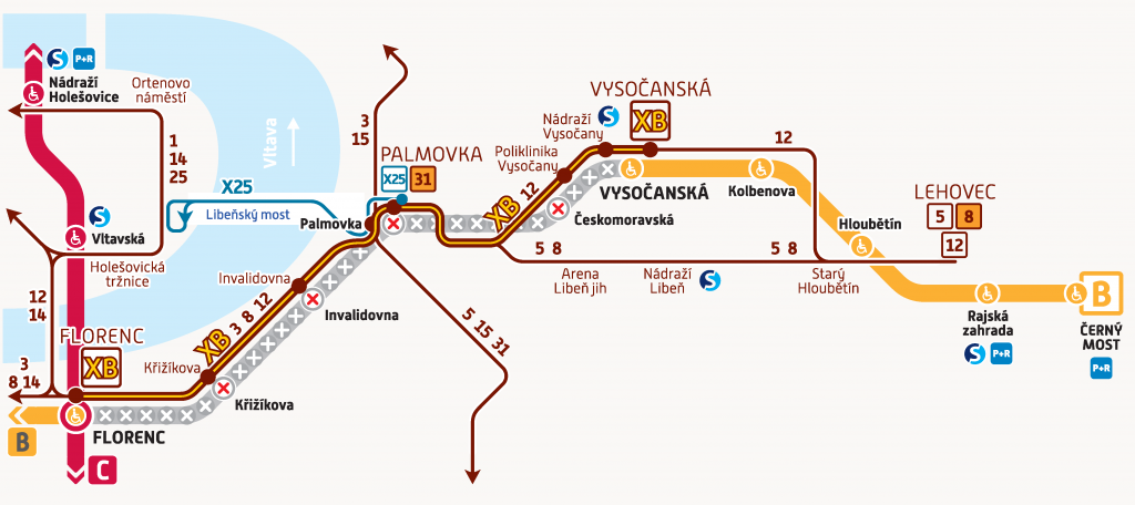 - Trasa linky XB: FLORENC – Křižíkova – Invalidovna – Palmovka – Poliklinika Vysočany – Nádraží Vysočany – VYSOČANSKÁ.