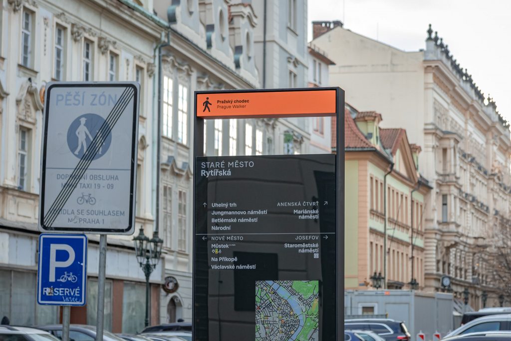Hlavní město Praha dokončuje v těchto dnech instalaci nového pěšího značení na 4 km dlouhé trase Václavské náměstí – Staroměstské náměstí – Letenské náměstí – Výstaviště. Celkem se na ní počítá s 23 prvky, z toho 15 obelisků a 8 směrovek, které nahrazují dosavadní již nevyhovující hnědé turistické směrovky. Nový systém pěší navigace Pražský chodec, vyvíjený v rámci projektu Čitelná Praha, byl v uplynulých letech testován na různých lokalitách města a nyní je poprvé představen v ucelené podobě na vytížené pěší trase, která kombinuje náročné prostředí památkové rezervace s prostředím městských parků i převážně rezidenční zástavby. Jeho hlavní předností jsou mapy orientované vždy ve směru pohledu diváka a jejich přehledné grafické zpracování. Nový systém sjednocuje grafiku s tou v pražském metru nebo na zastávkách MHD.