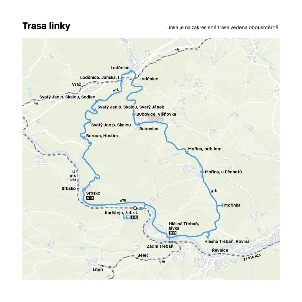 Z pražského Smíchovského nádraží trvá cesta vlakem linky S7 na Karlštejn pouhých 33 minut. Právě zde bude turistická linka 878 navazovat. Díky tomu se cestující dostanou do hodiny například do Svatého Jana pod Skalou nebo k lomu Amerika.