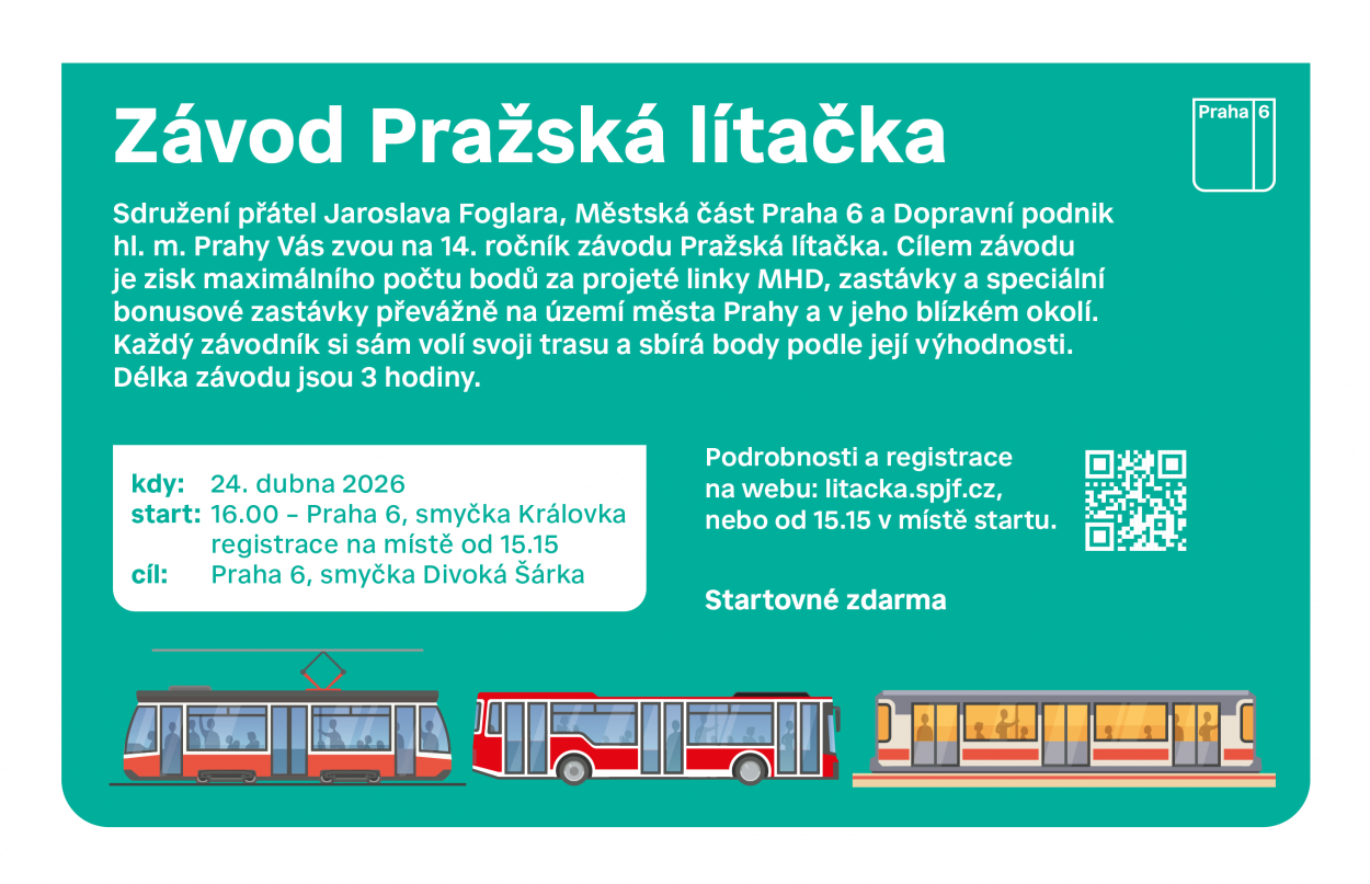 V pátek 24. dubna 2026 se v ulicích hlavního města uskuteční již 14. ročník orientačního závodu Pražská lítačka. Akci pořádá Sdružení přátel Jaroslava Foglara (SPJF) ve spolupráci s Městskou částí Praha 6 a Dopravním podnikem hl. m. Prahy (DPP). Cílem účastníků bude v časovém limitu projet co nejvíce bodovaných úseků a zastávek s využitím linek pražské integrované dopravy.