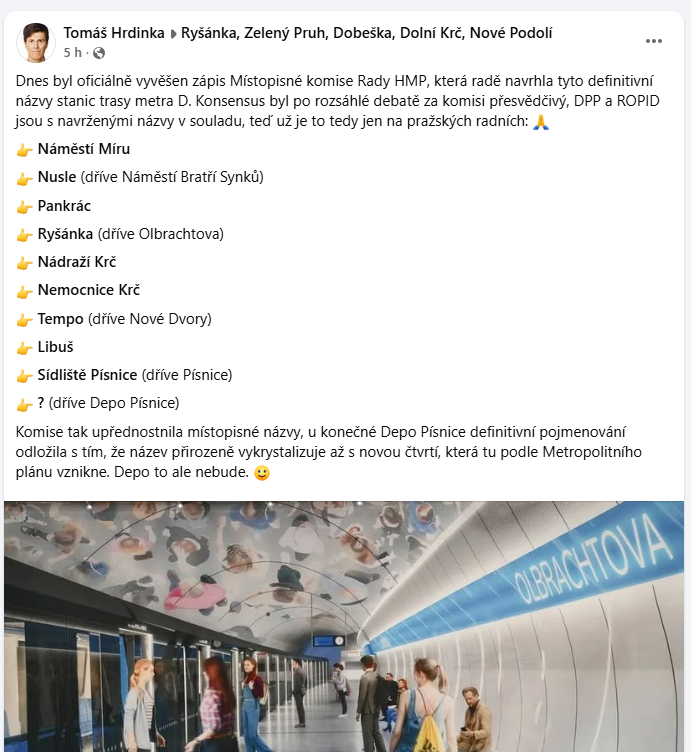 Debata o pojmenování stanic budovaného čtvrtého úseku pražského metra se posunula do další fáze. Místopisná komise Rady hlavního města Prahy (HMP) zveřejnila svůj návrh na definitivní názvy stanic trasy D. Zatímco u některých zastávek došlo ke shodě, u jiných se návrh komise rozchází s praktickým pohledem organizátora dopravy ROPID a Dopravního podniku hl. m. Prahy (DPP).