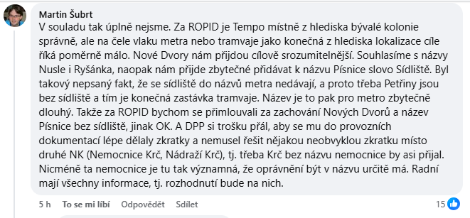 Další výhrada směřuje k názvu Sídliště Písnice. ROPID dlouhodobě prosazuje zkracování názvů stanic metra a vynechávání slova „sídliště“, jako je tomu například u stanice Petřiny (kde je název Sídliště Petřiny vyhrazen pouze pro tramvajovou zastávku). Podle Šubrta je přídomek „sídliště“ v metru zbytečně dlouhý a postačilo by strohé Písnice.
